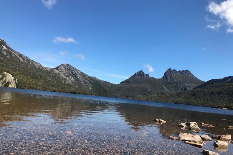 世界遺産「タスマニア原生地域」の代表的スポット。湖と切り立つ山々の絶景は圧巻。